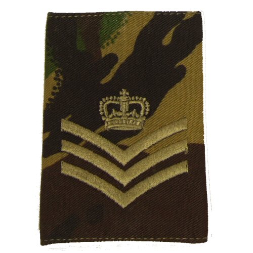 British Army rank slides in yellow-gold embroidery on DPM background. The rank slides are: (top row, left to right) Lance Corporal, Corporal, Sergeant, Staff Sergeant, Warrant Officer 2, Regimental Quartermaster Sergeant, Regimental Sergeant Major; (bottom row, left to right) Second Lieutenant, First Lieutenant, Captain, Major, Lieutenant Colonel, Colonel