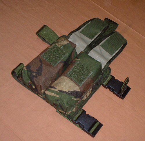 Low profile leg mounted double ammo pouch designed for latest operations in Iraq and Afghanistan. The pouch is made of milspec PU coated 1000D Cordura and is IRR treated. The pouch has two velcro pockets, each able to take two M16 or SA80 magazines in low profile on the leg. Each pocket has its own drainage hole. The back of the pouch is foam lined for comfort and weight distribution. The pouch is held onto the leg by means of two 40mm Cordura webbing straps reinforced with high-grade elastic to allow for stretch and comfort during movement. These straps are fitted with adjusting quick release buckles which are heat resistant. The leg extension strap is made of 50mm webbing which is fully adjustable with velcro and a plastic slider. The belt loop portion of the strap opens with velcro and is designed to form a loop to fit up to a 3 inch duty belt. This is fully compatible for use with the Wyvern All Arms vest, Wyvern All Arms belt kit or any vest fitted with a 50mm wide rectangular D-ring. Features: -Large carry capacity for various magzines. -Adjustable straps for adjusting to different leg and belt sizes. -Quick release clips on straps allow for quick removal or application of pouch. -Flaps close with velcro for speed and security. -Made from 1000D Cordura. -IRR treated.