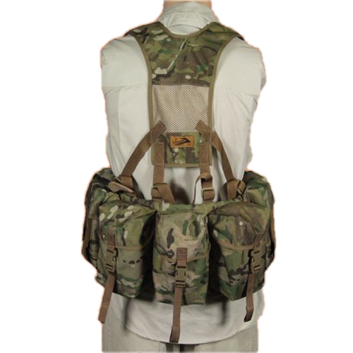 Rear of rig, with main utility pouches located at rear. Yoke attachment points are also visible. Yoke not included.