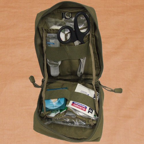 Detail showing the pouch loaded with first aid supplies. Plese note: note is for one pouch only. No supplies provided.