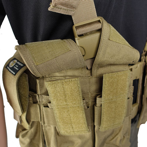 A Tan MOLLE rig optimised for rifle ammo carry is a vest based on the MLE adjustable yoke and cummerbund system, with four detachable, additional double magazine pouches, radio pouch and a drop leg dump pouch on rear. The magazine pockets can hold 2x M4 magazines per pocket, or a single G36, G3 or M14 magazine per pocket. Additional carriage space is provided on the rig itself with six magazine pockets and two zip pockets located in the cummerbund. The rig is highly adjustable for size, with extra strapping to allow the cummerbund sections to be worn as a chest rig without the yoke. The rig can be symmetrically laid out for best distribution of weight, but all the additional pouches can be removed and replaced as the entire system is MOLLE based. Incorporating a hydration carrier on the rear gives the wearer real longevity on the field with constant hydration. Ideal vest for hot weather and use in tight spaces. Buckles are from the Duraflex military Stealth warrior range, 1000D PU coated Cordura for durability.