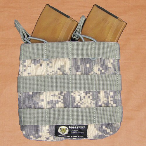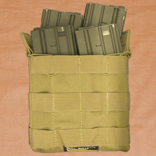 The Bulle MOLLE shingle or open Quad Pouch is a four magazine carrying version of the best selling Bulle MOLLE 5.56 D Mag Pouch. Designed to be able to carry up to two M4 or one AK magazines in each pocket, the pouch is open at the top, secured with elastic shock cords with 25mm webbing tabs for easy drawing of magazines. The pockets are positioned side by side, enabling the pouch to carry four magazines in total. The pouch dimensions are 145mm tall, 155mm wide and 40mm deep, which gives the pouch a low profile in relation to its carrying capacity with a medium space requirement on the MOLLE base. The open nature of the pouch makes it ideal for wearing on light rigs, chest rigs and the front section of the armour carrier for rapid ammo access. The elastic shock cords help to retain the contents and are adjustable for height by tying off the cords higher or lower as required. The pouch is fitted with MOLLE webbing across the front and sides to enable another layer of pouches to stack over the pouch if necessary. The pouch is made from military grade 1000D Cordura nylon and Cordura webbing. The rear of the pouch is fitted with 2 MOLLE vertical straps and additional MOLLE horizontal straps for interweaving onto the MOLLE base. The vertical straps are finished with press studs to the body of the pouch on the rear. Please note that price is for ONE pouch only. Accessories are shown for illustration purposes only and are not included. Features: -Holds up to 4x M4, M16 or SA80 standard magazines or 2 AK47 magazines -145mm tall, 155mm wide and 40mm deep -Open design enables fast access to the contents -Medium profile pouch with medium space requirement on the MOLLE base -Made from military specification 1000D Cordura material and Cordura webbing -Pre-fitted with standard size 25mm MOLLE vertical straps compatible with all US and UK systems