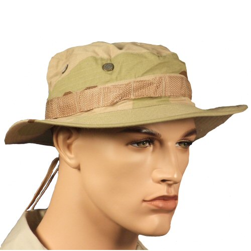 The Bulle US Tricolour boonie hat is made of genuine issue MIL-C-3924J Quarpel treated American cloth which is lightweight, wrinkle resistant, machine washable, ripstop. Quarpel treatment is a water repellent finish designed for military use. The boonie hat is patterned on the classic, US Army boonie hat shape, with wide brim, ventilation holes right and left and a band of webbing around the sweatband for addition of camouflage material. The hat is fitted with a stretchable chinstrap which adjusts to fit with a plastic shock cord toggle. The stretchable chinstrap allows for better movement without having to readjust the chinstrap. The hat matches with the Bulle US Tricolour BDU uniforms in Quarpel treated NYCO. Sizes available are: Small (56cm or 7 in), Medium (58cm or 7 1/4in), Large (60cm or 7 1/2in), XLarge (62cm or 7 3/4in), XXLarge (64cm or 8in).